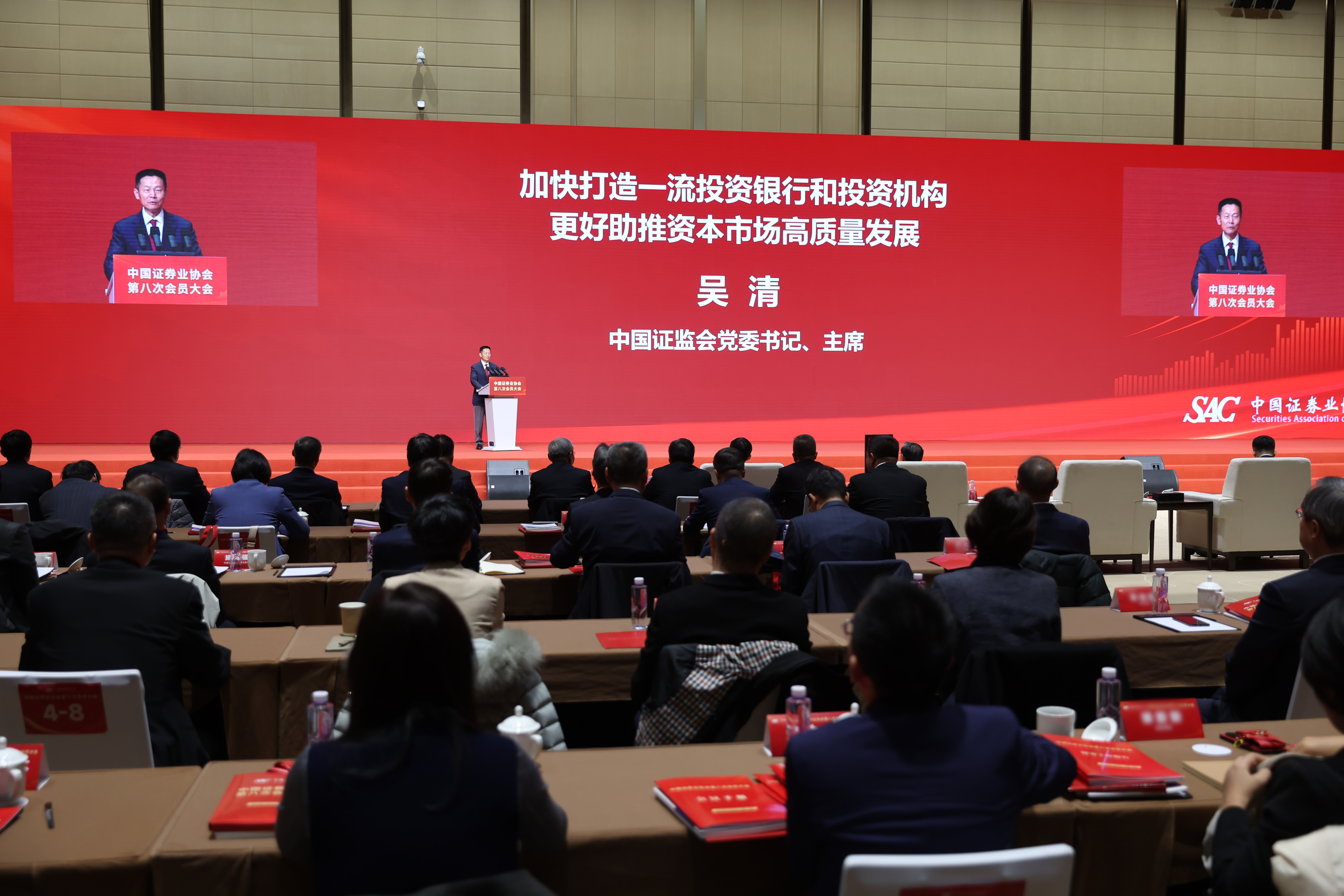 大家好!很高兴参加中国证券业协会第八次会员大会,我谨代表中国证监会,对大会的召开表示热烈祝贺,向与会的各位代表和全行业同仁致以诚挚的问候!党的二十届四中全会着眼于中国式现代化全局,对金融强国建设和资本市场高质量发展作出了重要部署。证券机构是资本市场上连接投融资各方最重要的桥梁纽带,对于市场功能发挥和生态完善至关重要。下面,我重点围绕推进证券行业高质量发展,同大家作个交流。