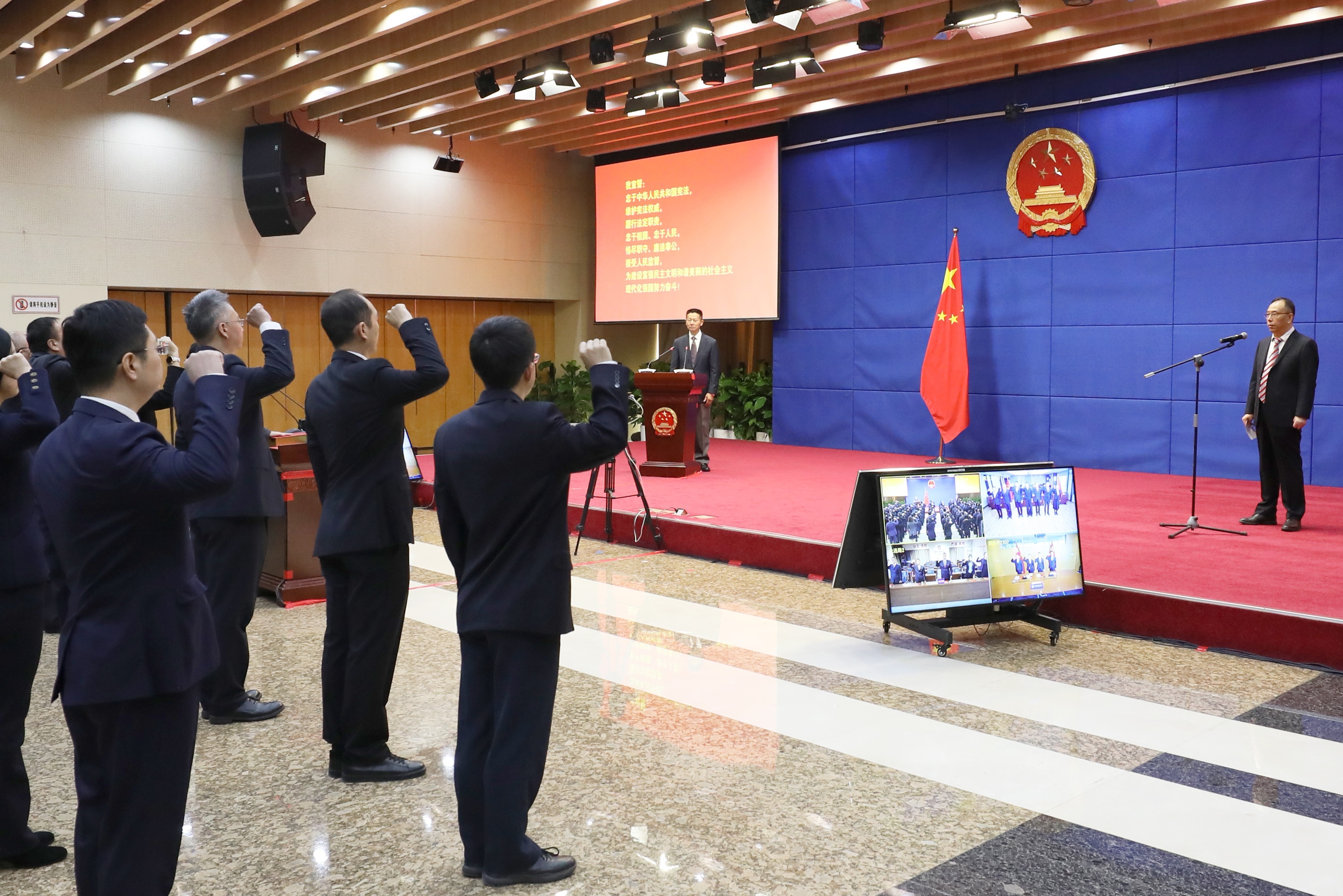 上午9时30分,宪法宣誓仪式开始,全体人员高唱中华人民共和国国歌。随后,领誓人手抚宪法、领诵誓词,其他宣誓人列队站立、跟诵誓词。